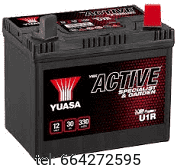 Akumulator YUASA Active Specialist & Garden 12V 30AH 27OA polaryzacja P+ wymiary w mm: dł/szer/wys/ - 190/125/181/. Końcówki biegunów płaskie. Symbol U1-R