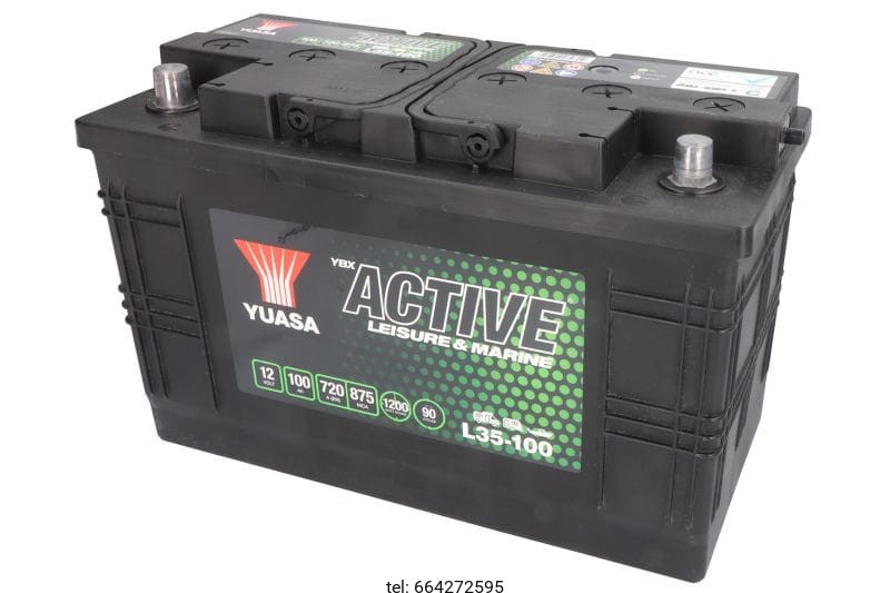 Akumulator YUASA Marine L35-100 12V 100 AH Prąd rozruchu 720 A. Polaryzacja L+ wymiary w mm: D/S/W/ - 350/174/225.Zaciski biegunów tradycyjne. Waga 24,7 kg. Akumulator bezobsługowy technologia kwasowo-ołowiowa. Bateria ta jest dedykowana do pojazdów wodnych oraz przyczep kempingowych oraz zasilania urządzeń elektrycznych. Nie prowadzimy sprzedaży wysyłkowej akumulatorów Yuasa.