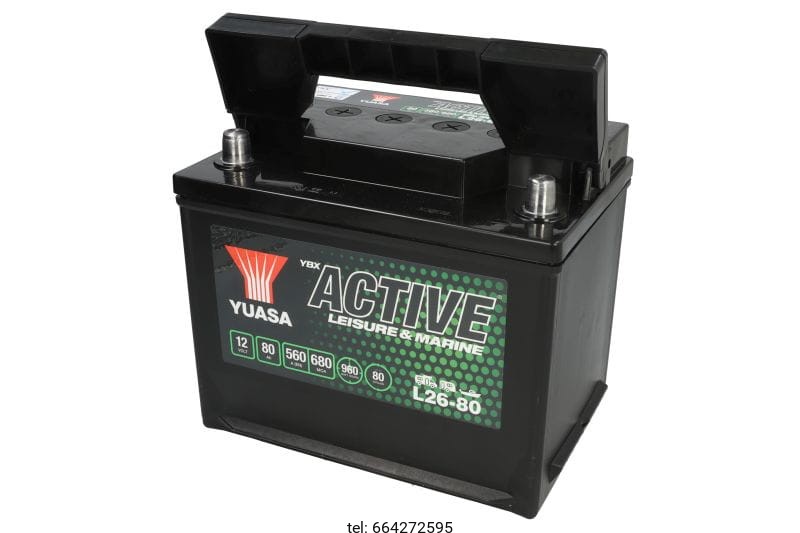 Akumulator YUASA Leisure & Active Marine L26-80 12V 80 AH Prąd rozruchu 560 A. Polaryzacja L+ wymiary w mm: D/S/W/ - 260/174/225.Zaciski biegunów tradycyjne. Waga 18 kg. Akumulator bezobsługowy technologia kwasowo-ołowiowa. Bateria ta jest dedykowana do pojazdów wodnych oraz przyczep kempingowych oraz zasilania urządzeń elektrycznych. Nie prowadzimy sprzedaży wysyłkowej akumulatorów Yuasa.