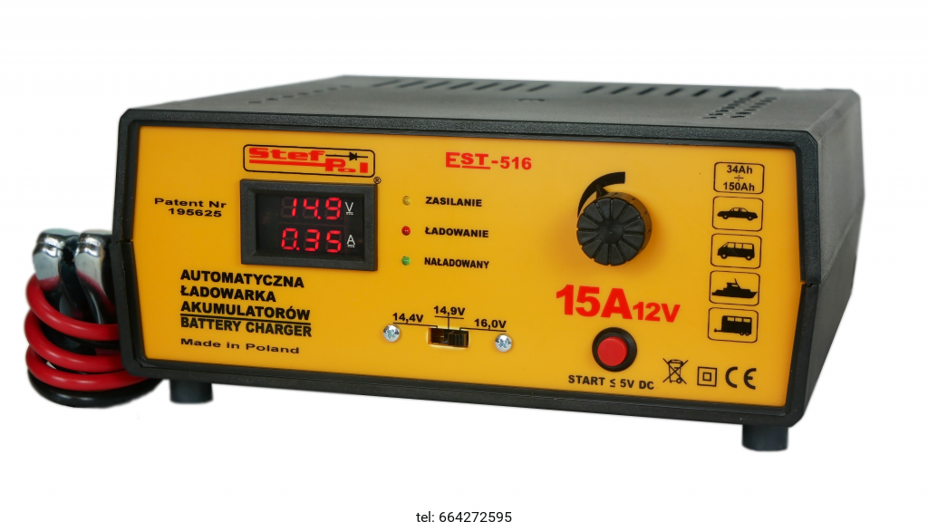 Ładowarka EST-516P12V/15A Ładowarki EST - 516P przeznaczone są do samoczynnego ładowania akumulatorów bezobsługowych, żelowych i ołowiowo - kwasowych o napięciu 12V i pojemności 34 ÷ 150Ah.